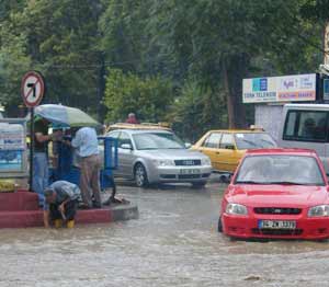 Yağmur sonrası araçlar ilerlemekte güçlük çekerken, bazı vatandaşlar ayakkabılarını çıkararak yolun karşısına geçmeye çalıştı. Bir babanın çocuğuyla yolun karşısına geçebilmek için kaldırımdan atlamaya çalışması ilginç görüntüler oluşturdu.