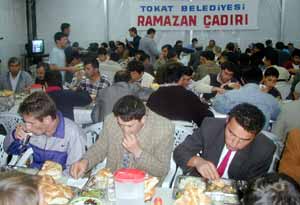 Tokat Belediyesi tarafından iftar çadırında verilen yemeğe, Vali Ayhan Nasuhebyoğlu, Belediye Başkanı Adnan Çiçek, İl Emniyet Müdürü Atilla Çınar, daire müdürleri ve vatandaşlar katıldı.