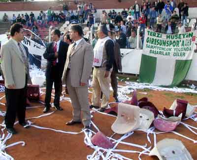 Bütün ikazlara rağmen taşkınlıklarını sürdüren Giresunspor taraftarları, Emniyet Müdürü Atilla Çınar’ın talimatı ile göz altına alındı. Gözaltına alınmak istemeyen taraftarlar, polise güçlük çıkarırken, yaşanan tartışmalar arbedeye döndü. 6 taraftarın gözaltına alındığı devre arasında, Giresunspor Teknik Direktörü Aldoğan Argun’un, Giresunspor taraftarlarına "sakin olun" uyarısı sonrası iyice çılgına dönen taraftarlar, sahaya tekrar tribün koltukları ve konfeti atmaya başladı. İl Emniyet Müdürü Atilla Çınar, tribünden atılan koltuklardan son anda kurtuldu. Çıkan olaylarda saha tam bir savaş alanına dönerken, polisin müdahalesi ile olaylar büyümeden önlendi.