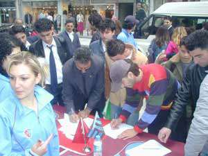 Trabzonspor Taraftarlar Derneği tarafından düzenlenen imza kampanyasında TFF Başkanı Levent Bıçakçı ve Hakem Cem Papila istifaya davet edilirken, bordo-mavili taraftarlar da Zorlu Grand Otel yanında açılan standa gelip imza atarak kampanyaya ilgi gösteriyor.