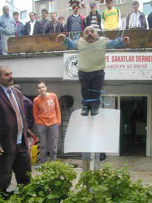 Sakatlar Derneği Trabzon Şubesi üyeleri, Engelliler Yasasının TBMMden çıkarak kanunlaşmamasını, 78 santimetre boyundaki İsmail Soylu isimli bir arkadaşlarını çarmıha gererek protesto etti.