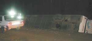 Edinilen bilgiye göre, İstanbuldan- Bartın istikametine seyir halinde bulunan Seyhan Süyer (25) idaresindeki 74 AC 008 plakalı otobüs, "duble" yol çalışması olan Çaycuma ilçesi Kayşıkçılar köyü yol ayrımında yan yattı. Otobüs içerisinde bulunan 9 yolcunun yaralanarak Çaycuma Devlet Hastanesine kaldırıldığı bildirildi.
