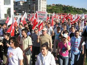 Zonguldakın Ereğli İlçesinde binlerce kişi, Ereğli Demir ve Çelik Fabrikalarının (ERDEMİR) satışını protesto etmek için düzenlenen eyleme katıldı.