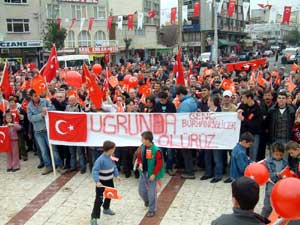 Çeşitli sivil toplum kuruluşlarınca tertiplenen "Bayrağa Saygı Yürüyüşü"ne yaklaşık 3 bin kişi katıldı. Burhaniyeliler, "Bayrağa uzanan eller kırılsın" şeklinde sloganlar atarak, ellerinde bayraklarla yürüdü. Yürüyüş, Halk Kütüphanesi önünden başladı. Kalabalık, sloganlar ve davul zurna eşliğinde Hürriyet Caddesini takiben, Cumhuriyet Meydanına kadar yürüdü.