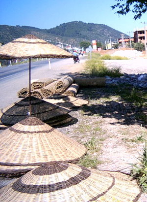 Balıkesir’in Edremit İlçesi’ne bağlı Altınoluk Beldesi’nde ayit bitkisinden yapılan güneş şemsiyeleri Yunanistan’a ihraç ediliyor.