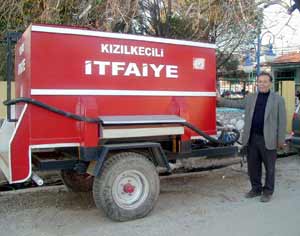 Aracın 2 bin YTLya mal olduğunu kaydeden Akçay, römork üzerine sacdan depo yaptıklarını ve motor eklediklerini anlattı. Öte yandan, köy meydanında Osmanlı döneminden kalma yangın tulumbası da hatıra olarak teşhir ediliyor.