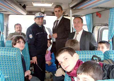 Milli Eğitim Şube Müdürü İsmail Kurt, şef Hüsnü Hoşgör ve Trafik Büro Amiri İdris Uysal, taşıma merkezi olan ilköğretim okullarına servis yapan araçları denetledi.