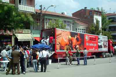 Afetlerden korunma ve sağlık konusunda vadandaşları şuurlandırmak için yola çıkan TIR’da, yaşanmış olaylardan çekilmiş 45 resmi sergileniyor. TIR’ı gezenlere ayrıca solunum testi yapılarak, akciğer promlemi olan hastaları tespit ediliyor.