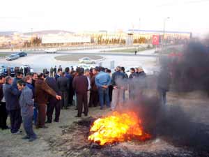 Organize Sanayi Bölgesi karşısındaki alanda bir araya gelen kamyoncular, kendileriyle görüşme talebini kabul etmeyen fabrika yöneticilerini protesto etmek için bulundukları alanda lastik yaktı. Bunun üzerine olay yerine jandarma ekipleri geldi.