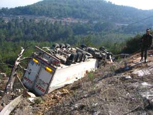 Antalyadan yüklediği portakalları İstanbula götüren Arif Taşan (31) idaresindeki 33 TF 248 plakalı TIR, Gülümbe rampalarında virajı alamayarak, 60 metrelik uçuruma yuvarlandı.