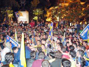 Fenerbahçenin ezeli rakibi Galatasarayı Süper Ligin bitimine 1 hafta kala 1-0 mağlup ederek şampiyonluğunu ilan etmesinin ardından Bursada Fenerbahçe taraftarları sokaklara taştı.