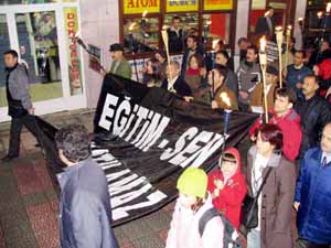Yaklaşık 100 kişilik grup, Setbaşı Meydanı’ndan heykel önüne kadar meşale, pankart ve sloganlarla yürüyerek, Eğitim-Sen hakkında çıkan kapatılma kararını protesto etti. Ahmet Vefik Paşa Tiyatrosu önüne gelen göstericiler, "Baskılar bizi yıldıramaz" "Yaşasın özgürlük mücadelemiz", "Geleceğimiz ve haklarımız için mücadelemiz sürecek", "Eğitim-Sen kapatılamaz", "Direne direne kazanacağız" şeklinde sloganlar atarak, mum bırakma eylemi yaptılar.