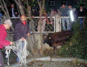 Caddeye fırlayıp Bursa-İstanbul yolunu birbirine katan kızgın boğa, trafiği altüst ettikten sonra bir düğün salonunun bahçesine girdi. Oğlunun düğünü için gün almaya gelen Panayır Mahallesi Muhtarı Dursun Kara, boğaya müdahale etmek isteyince canından oluyordu. Boğanın yerde 25 metre sürüklediği Kara, ağır yaralandı. Bu sırada boğanın elinden muhtarı kurtarmaya çalışan bir vatandaşta yaralandı.