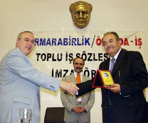 Marmarabirlik işçileriyle sendika yöneticilerinin hazır bulunduğu törenin ardından, toplu iş sözleşmesi Taviloğlu ile Uslu arasında imzalandı. El sıkışan iki başkan, toplu görüşmelerdeki barıştan yana olan karşılıklı tavırlarından dolayı birbirlerine plaket verdi.