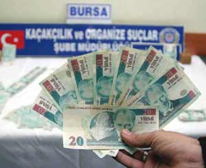 Bursa’da bir istihbarat üzerine parka baskın düzenleyen mali polis, 46 adet sahte 20 YTL ele geçirdi. YTL’lerin güvenlik özelliklerinin orijinaline benzetilmeye çalışıldığı; ancak kalpazanların başarılı olamadığı belirlendi.