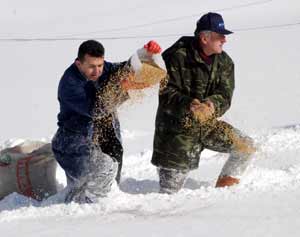 Orman ve Çevre Müdürlüğü ekipleri Uludağdaki kuş, sincap ve tavşan gibi hayvanlar için de ormanlık alana çuvallar dolusu arpa ve mısır bıraktı. Görevliler bir metreyi bulan karda zor anlar yaşarken, bata çıka ormanlık alana girip yemleri dağıttılar.