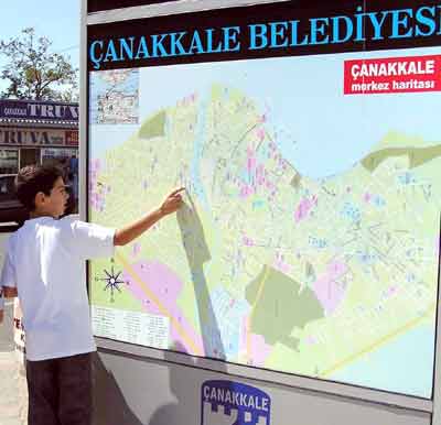 Çanakkale Belediyesi’nin iskele meydanına koyduğu yönlendirme haritası vatandaşların gitmek istedikleri yerlere kısa sürede ulaşmalarını sağlıyor. Çanakkale Belediyesi yetkilileri, iskele meydanına koydukları harita sayesinde vatandaşların ulaşmak istedikleri yerleri rahatlıkla görebildiklerini belirterek, "Bu harita üzerinde cadde ve sokak isimlerinin yanısıra, önemli yerleşim birimleri de nokta olarak belirtiliyor. İsteyen vatandaşımız bu harita üzerinden ulaşmak istediği yeri rahatlıkla bulup bu yere gidebiliyor" dediler.