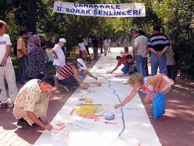 Öte yandan, şenlikte en fazla ilgiyi, halk bahçesinin girişinde yere serilen ve herkesin içinden geldiğince resim yaptığı 45 metre uzunluğundaki dev tuval gördü. Ressam Rıfat, ilk kez böyle bir tuval üzerine resim yapıldığını belirterek, "45 metre uzunluğunda tuvale, şenliğe katılan herkes içinden gelen duyguları çiziyor. Yaklaşık 25 kilogram boyanın kullanıldığı dev tuval üzerindeki resimler daha sonra sergilenecek" diye konuştu.