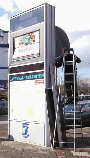 Çanakkale’de bir firma tarafından belediyeye hibe edilen, ancak daha sonra çeşitli sebeplerden dolayı arızalanan elektronik reklam panosu, tamir edilerek yeniden hizmete sokuldu.
