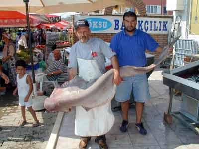 Engin Malkoç’a ait teknenin Babakale açıklarında yakaladığı 100 kilo ağırlığındaki camgöz cinsi köpek balığı, Küçükkuyu’da bir balıkçı tezgahında sergileniyor. Köpek balığını merakla inceleyen tatilciler, canavarla resim çekilmeyi de ihmal etmedi.
