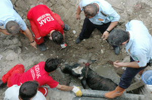 Edirnede, içi su dolu çukura düşen inek, kurtarma ekiplerini seferber etti. Gebe inek, 3.5 saatlik çalışma sonucu halat yardımıyla kurtarıldı.