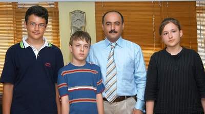 Verdiği eğitimle Orta Öğretim Kurumları Sınavı’nda Türkiye birincisi çıkaran Güngören Merter Fatih Koleji, bu başarısını Başkanımız Şakir Yücel Karaman ile de paylaştı. OKS birincisi Reyyan Ergüder yanı sıra, yine aynı okuldan OKS 7.’si Yusuf Furkan Özaltan ve 36.’sı Furkan Çağrı Top’u, Okul Müdürü Osman Alp’le birlikte ağırlayan Başkanımz, konuklarını çeşitli hediyelerle ödüllendirdi. Sergilenen bu başarının devamı için ellerinden gelen yardımı yapacaklarını kaydeden başkanımız, tatile çıkmaya hazırlanan öğrencilere birer dijital fotoğraf makinesi ve çini vazolar verdi. Ergüder’e ayrıca içerisinde 10 adet tam altın bulunan bir de kese veren Karaman, Özaltan ve Top’a da 5’er altın hediye etti.