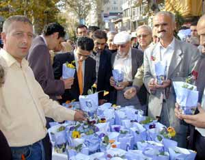 Yürüyüş yolunda 6 değişik notkada ve ilçelerde de aynı anda dağıtılmaya başlanan menekşelere vatandaşlar büyük ilgi gösterdi.