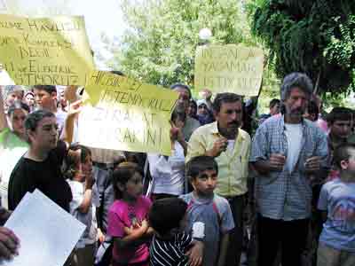 Depremzedeler adına konuşan Nuri Keleş isimli vatandaş, "Bizi evlerimizden çıkartarak prefabrikleri satmak istiyorlar. Oysa biz burada bedava oturalım demiyoruz. Madem bu prefabrikleri satacaklar, bize satsınlar. Son olarak elektrik ve sularımızı kestiler. Yetkilileri bizim derdimize sahip çıkmaya çağırıyoruz" dedi. Minik çocuklar da, ellerine aldıkları boş pet şişeleri göstererek anne ve babalarına destek verdi.